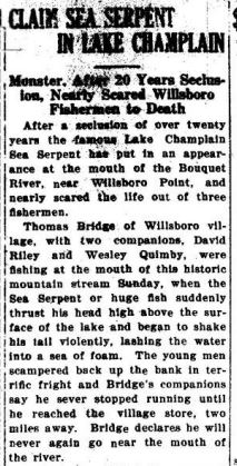 Local newspaper accounts of Champ sightings, (left to right) from the Essex County Republican (1895), and Ticonderoga Sentinel (1929, 1937)
