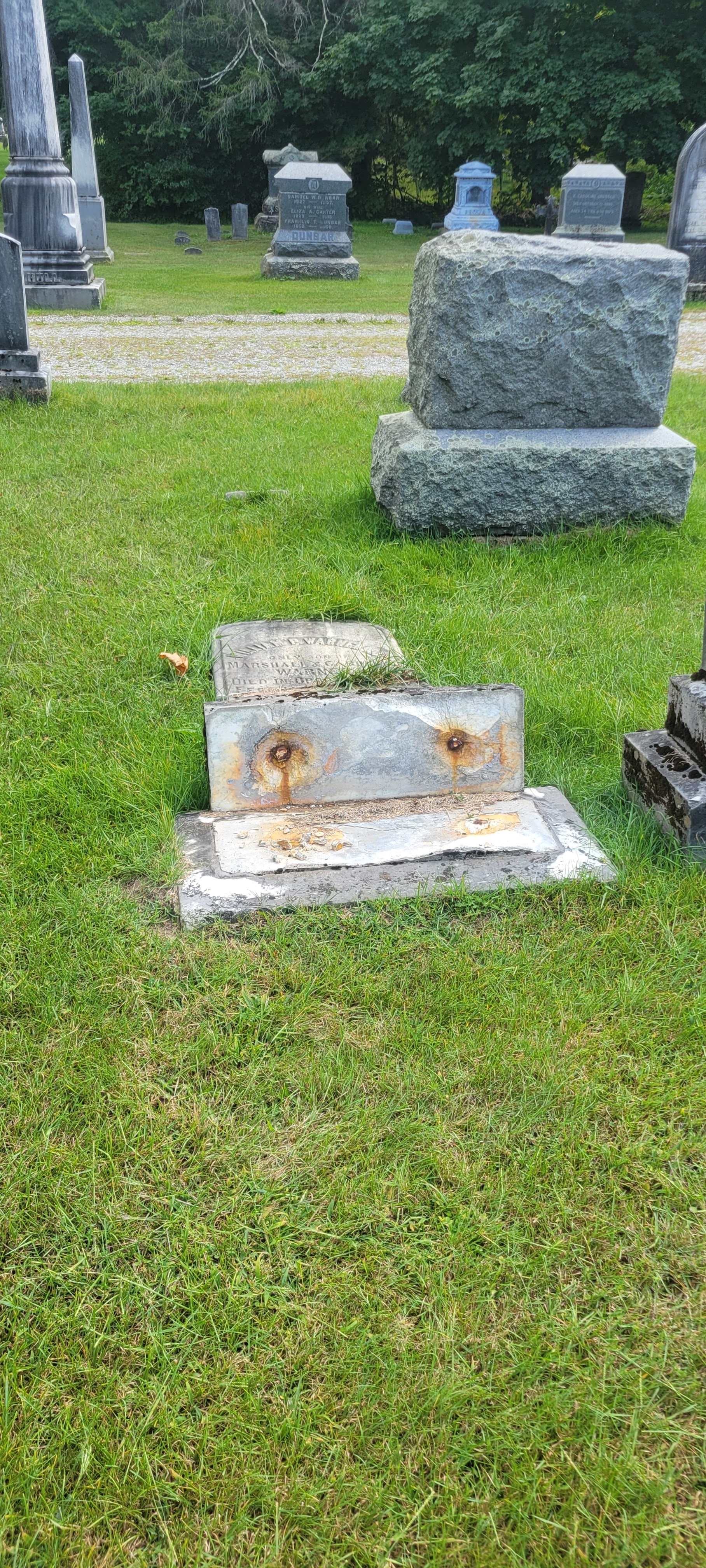 A toppled headstone. Photo credit: Ian Stewart, Preservation Inc.