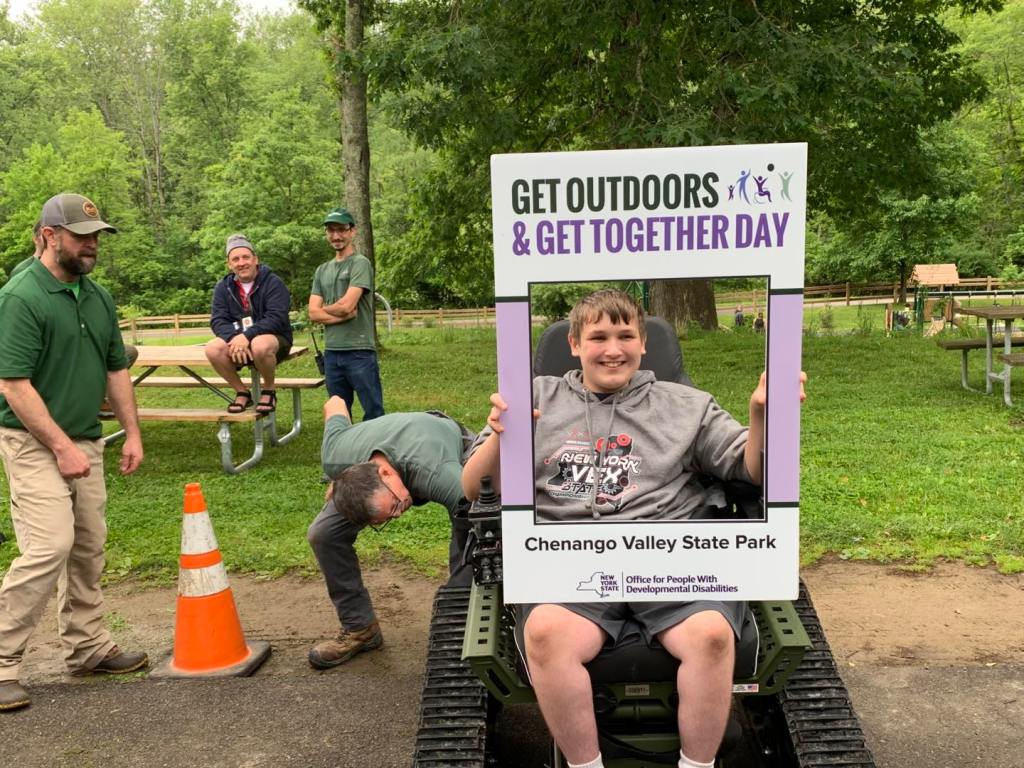 Trying out Chenango Valley State Park’s new Action Trail chair and posing with the iconic Get Outdoors and Get Together Day frame.
