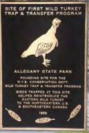 Wild turkeys, now widespread throughout New York, owe that comeback to Allegany State Park, the Regional Park Commission, and the Conservation Department. These birds were largely absent from the state by the beginning of the 20th century, due to overhunting and habitat loss, but in the 1940s, a small population of birds had come into the park, likely from Pennsylvania to the south. From the 1950s to the mid-70s, wild turkeys in the park were live trapped by wildlife officials, who used net-firing cannons to safely capture the birds, which were then taken to the Catskills, Adirondacks and elsewhere in New York state to reestablish the birds in the wild. Some turkeys were even sent to other states in the Northeast and to Canada as part of wildlife restoration efforts there.