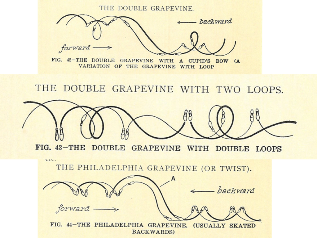 Watchers of skating today might not recognize this move, but the double Philadelphia grapevine was seen as one of the most complex techniques of its time. As described in a contemporary magazine: “The double grapevine is the same as the single, except that a loop is introduced at the beginning and also at the end of the figure. It is executed, as in the single grapevine, by passing the right foot in front of the left foot with the chain step; but instead of making a half revolution, as in the single, the body is swung completely around by the means of two turns on the right foot and an inside loop on the left.”