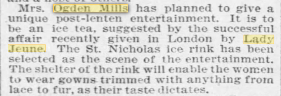 So here, Ruth Mills got to combine her interests in both luxurious entertaining and skating. Sadly, the St. Nicholas Rink was demolished in the 1980s after a long history of hosting skating and boxing matches.
