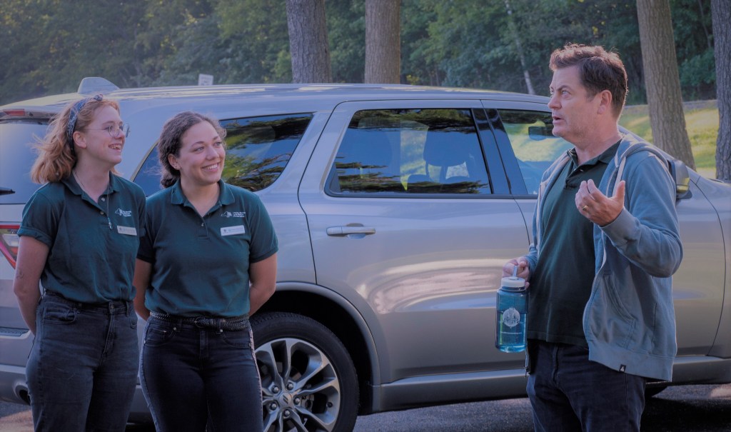 Offerman chats with Parks Student Conservation Association members Anna Pirkey and Grace Brennan (l-r).