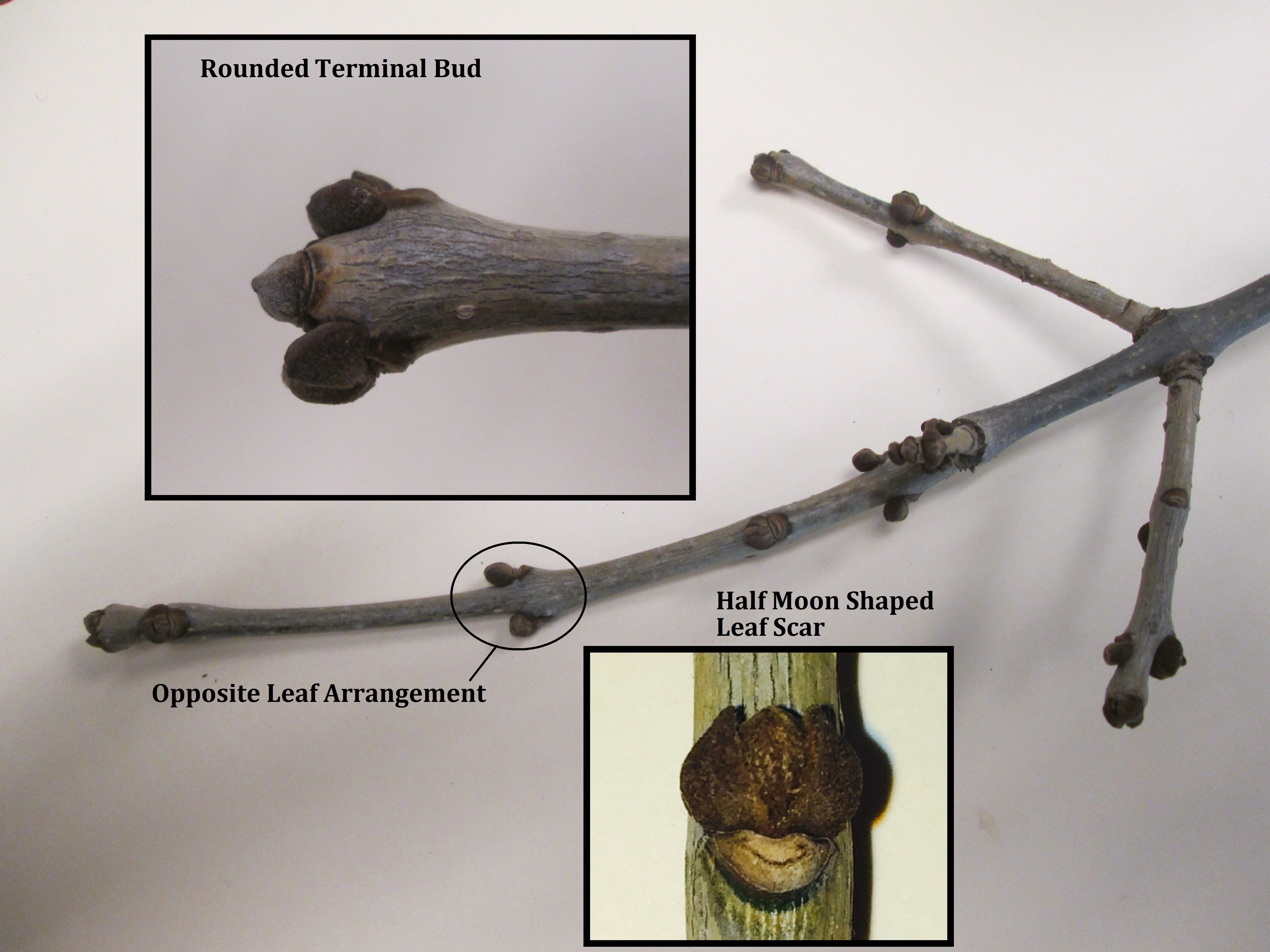 Now we will look at the characteristics of the twig: Notice how the leaf buds are rounded and in an opposite arrangement at the leaf node. The leaf scar is shaped like a half moon or an upside-down “D”. The stem is grey in color and the buds are a dark greyish-brown. There is one bud at the apex, or tip of the stem. White ash is very similar, but the leaf scar has a v-shaped notch on the top and the twigs tend to be gray-green.