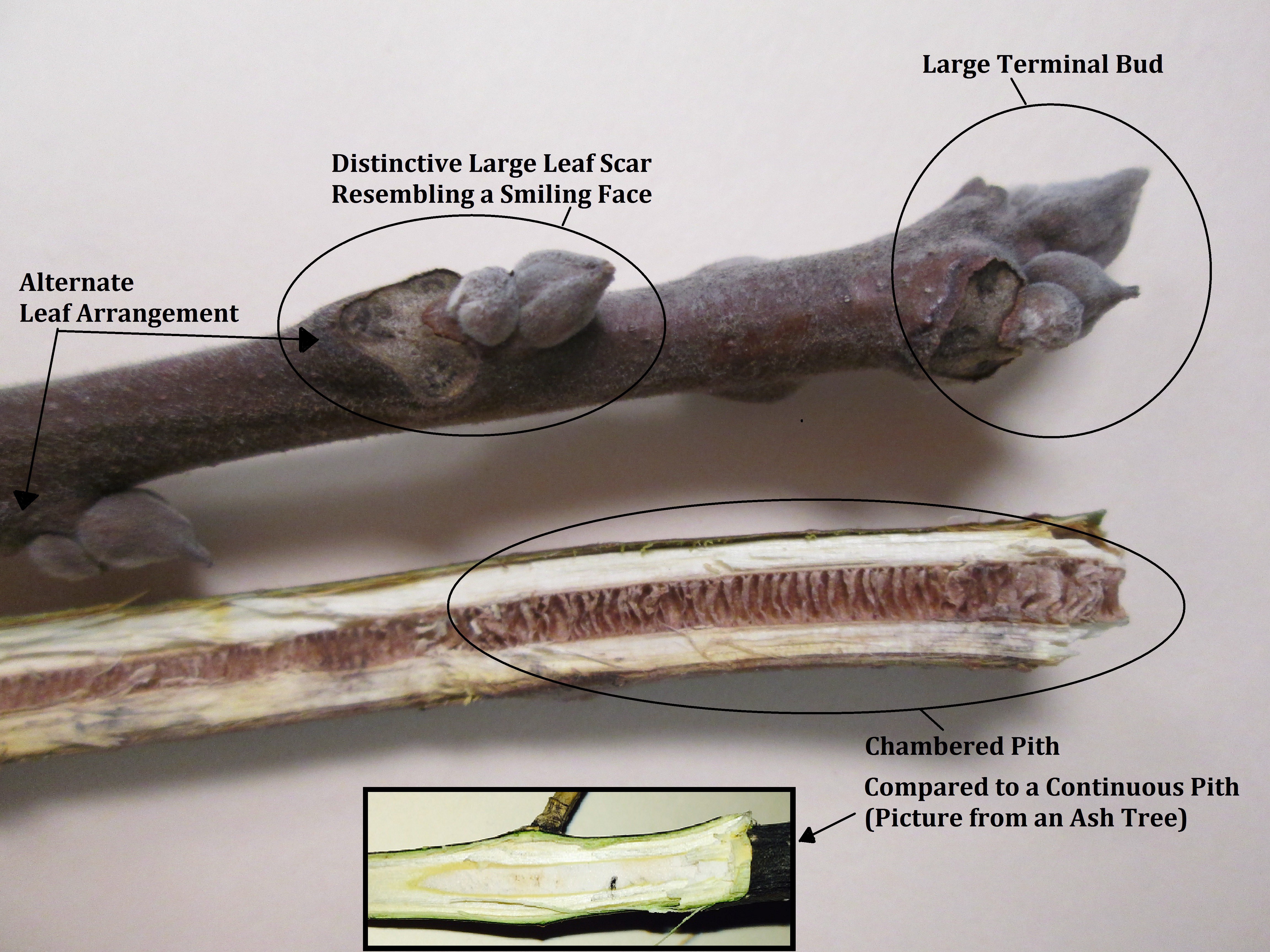 Black walnuts have alternate leaf arrangement with a large terminal bud. The buds are fuzzy and light gray in color. The leaf scar is large compared to the bud. The pith (spongy tissue in the center of the stem) is distinctly chambered. This can be seen by carefully taking a sharp blade and cutting the stem in half, as shown in the image below.
