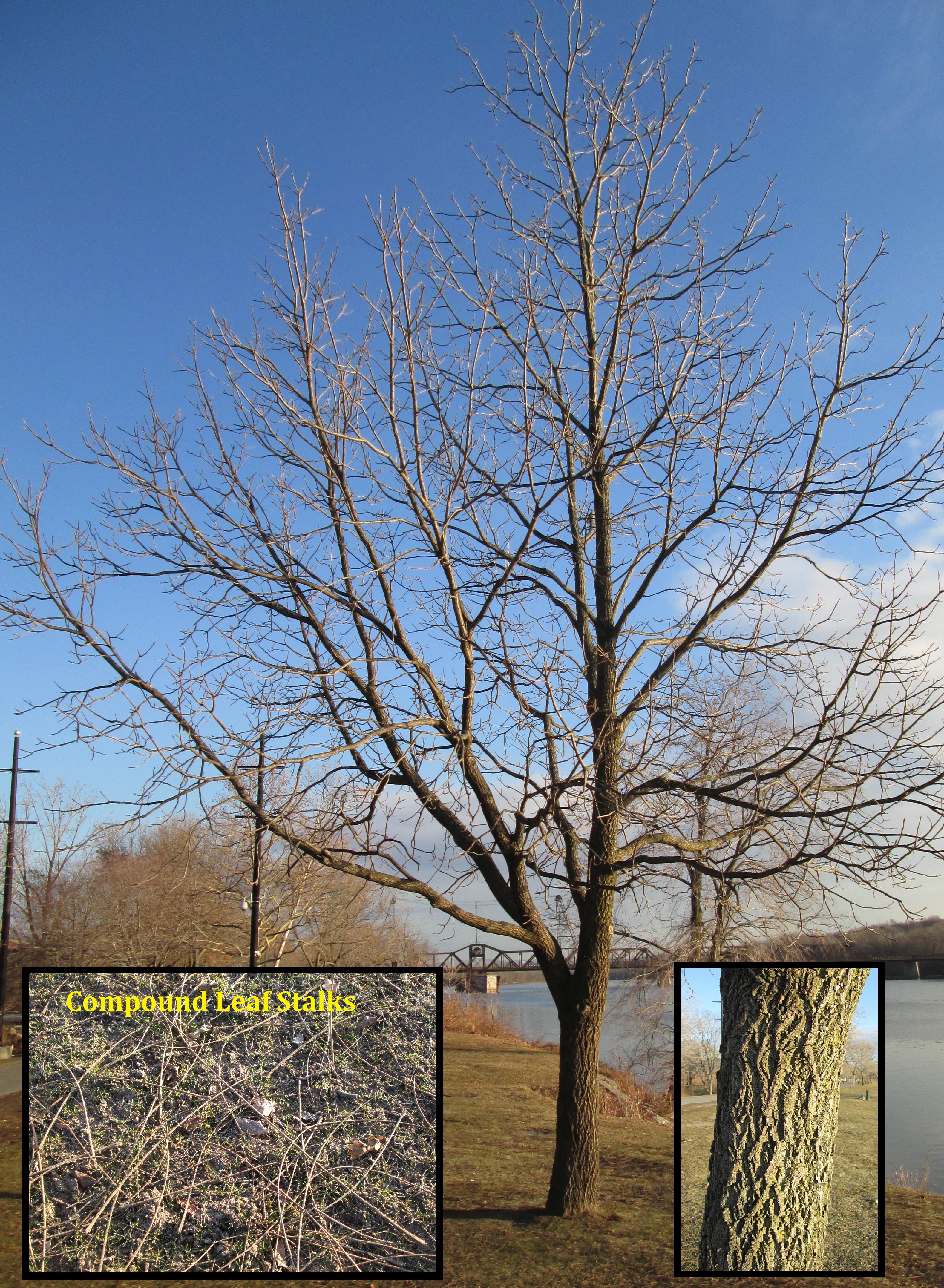 Black walnut trees have a wide branching growth pattern. The bark is dark brown, becoming darker with age. The bark has deeper furrowed ridges than ash, with looser intersecting ridges. Also evident is the dropped compound leaf stalks* underneath the tree. Black walnut trees are found growing in well drained, lowland areas.