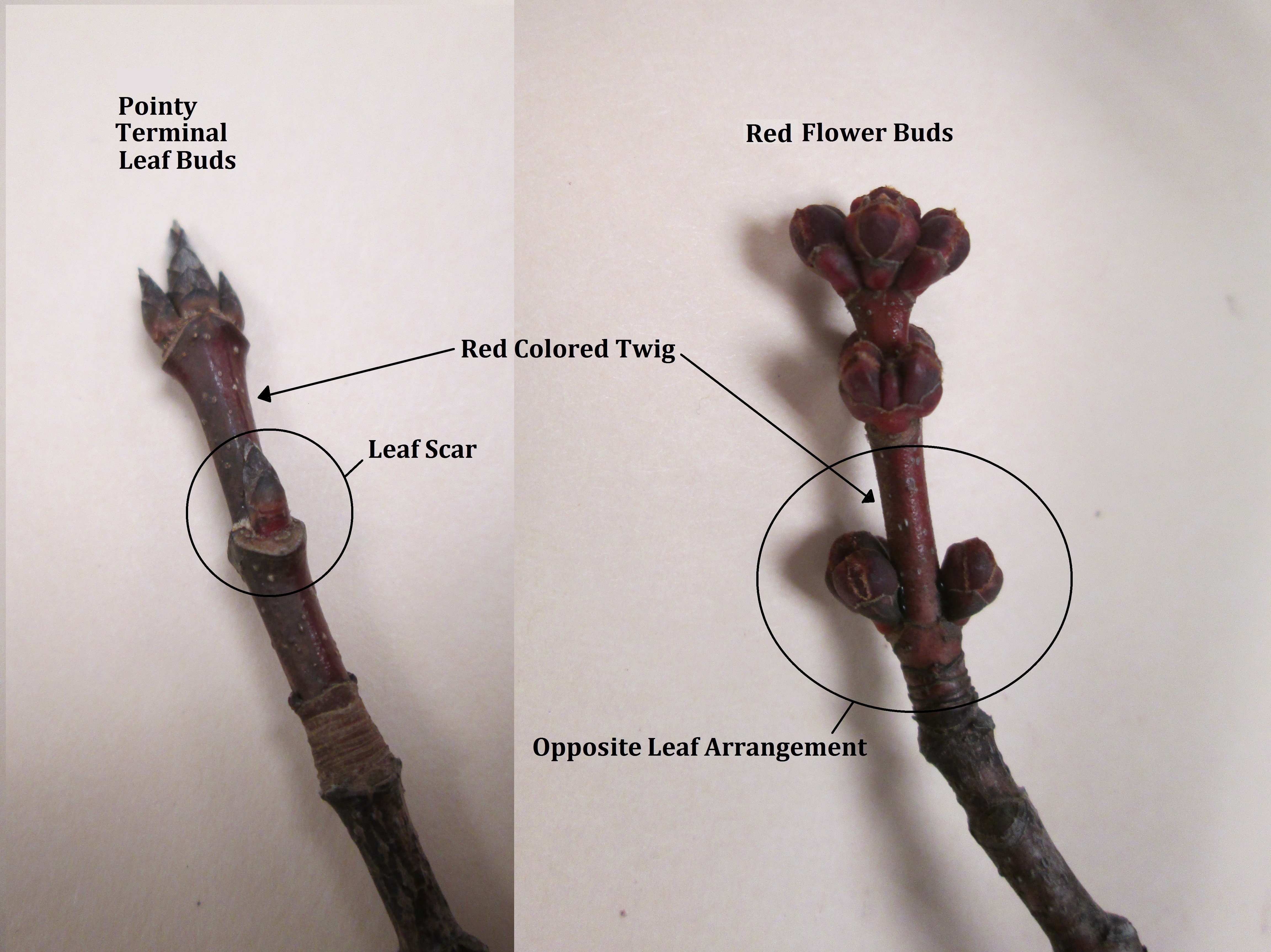 Red maples have opposite leaf arrangement. Flower buds usually form high up in the canopy and not on lower branches. Once the flowers have bloomed, leaves will replace them on the same node. The leaf and flower buds are reddish in color, as is the stem itself. The leaf buds are pointed and there is one terminal leaf bud.