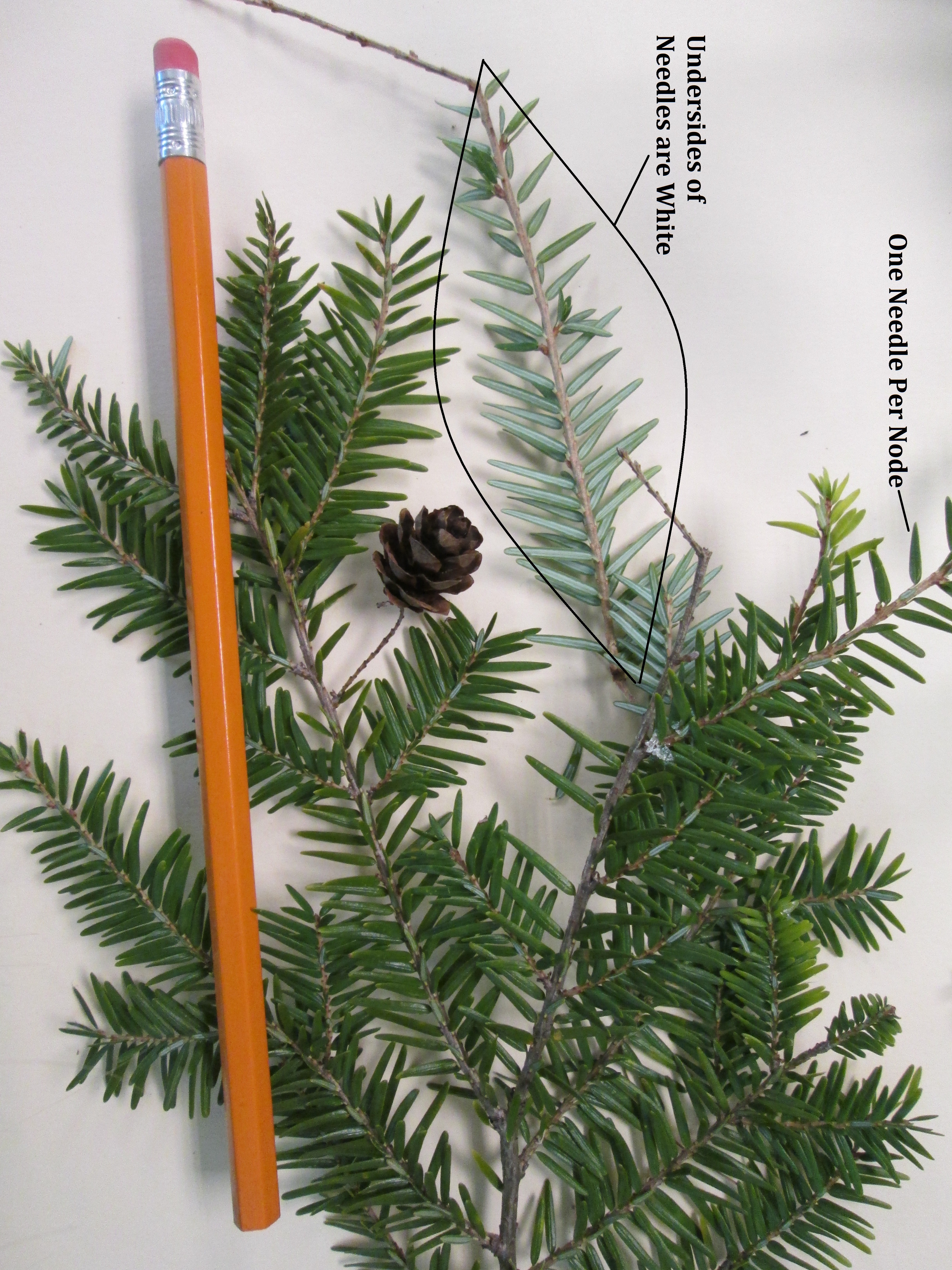 Hemlock does not have bundles of needles, just one short needle per node. The needles are yellow-green in color and are soft and flexible. The underside of the needle is whitish. The cone is small and round, under an inch in length. The twig is thin and flexible.