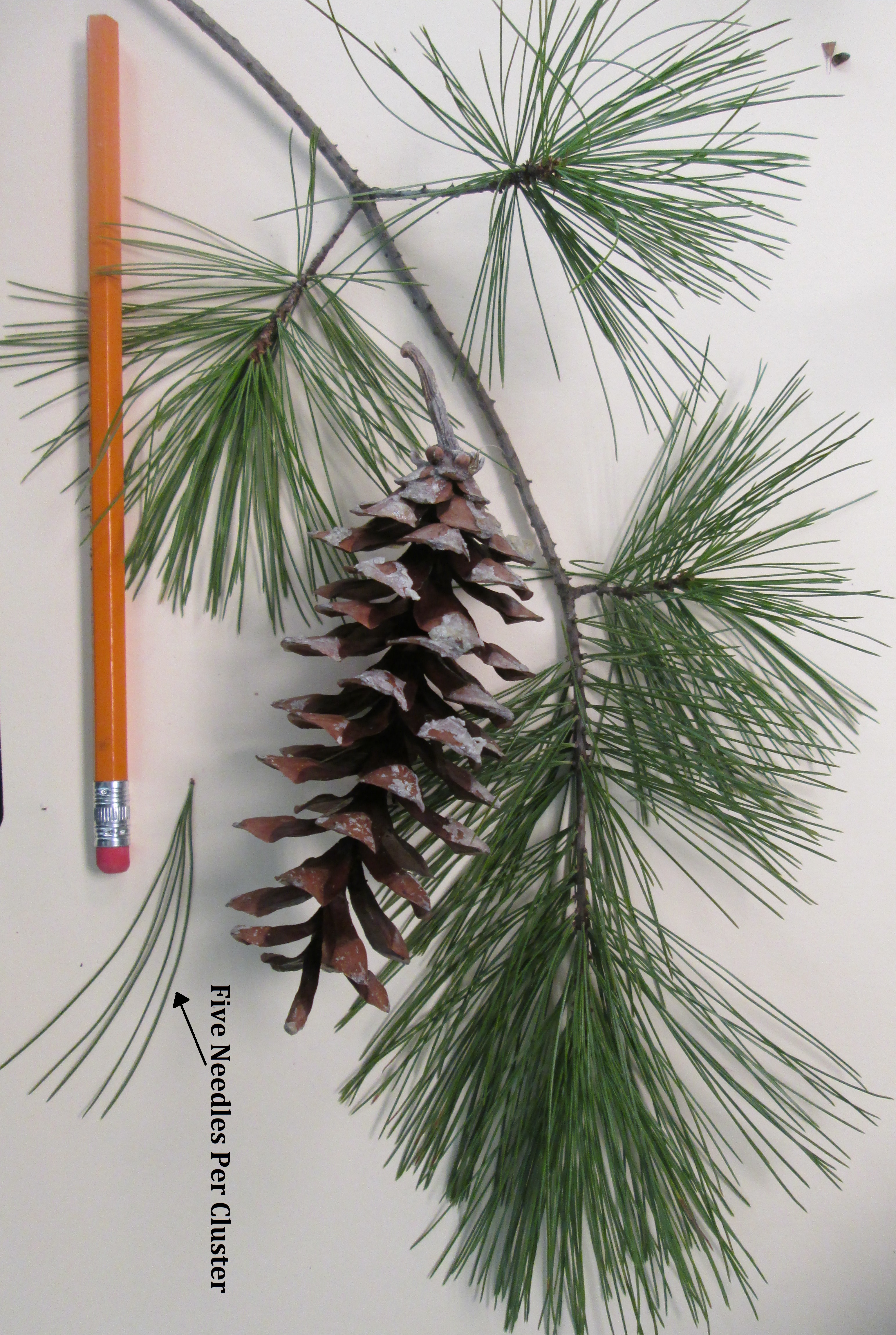 White pine has 5 needles per bundle. The needles and stem are flexible and slender. The cone is long and narrow and about 3 to 8 inches in length. Needles are light green in color.