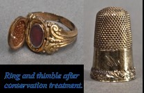Those searches yielded some similar objects, but none were identical. Massie then researched museum jewelry collections. “Here, I found more success in styles close to the ring with generic 19th century dates,” she said. “With the help of colleagues, I was able to contact curators who specialize in 19th century jewelry to better date the items. They believed that the ring and thimble dated from the 1850s to 1860s. Goldstone was very popular then and the thimble’s more simple design, suggested an earlier 19th century date.”