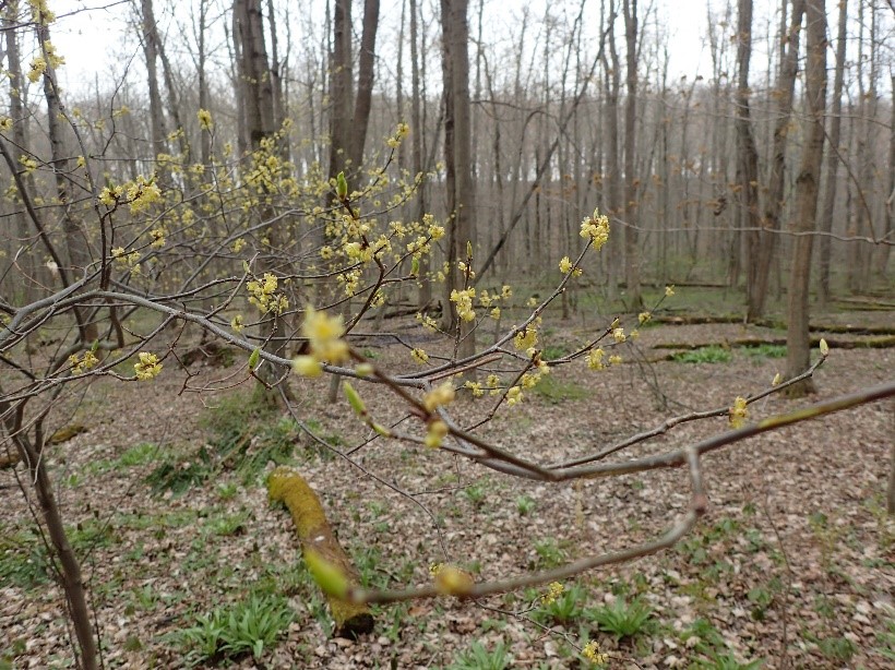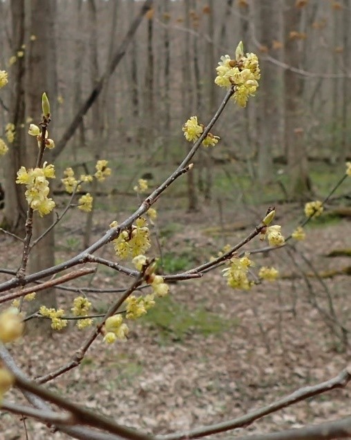 Spicebush (Lindera benzoin) is very common in moist woods and along streams. If you scratch the stem you can smell the spiciness, a bit like cinnamon. Note the clusters of tiny five-petaled flowers along the stems.