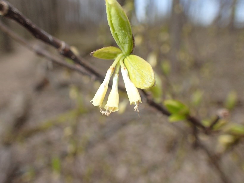 Much less common and usually found in calcareous soils, often in moist woodlands, is leatherwood (Dirca palustris). This gets its name from the very pliable branches – you can bend them in a U shape without breaking it. The flowers of leatherwood are like small tubes. They might be mistaken for honeysuckle (Lonicera spp.) which have larger and more open flowers and more brittle twigs.