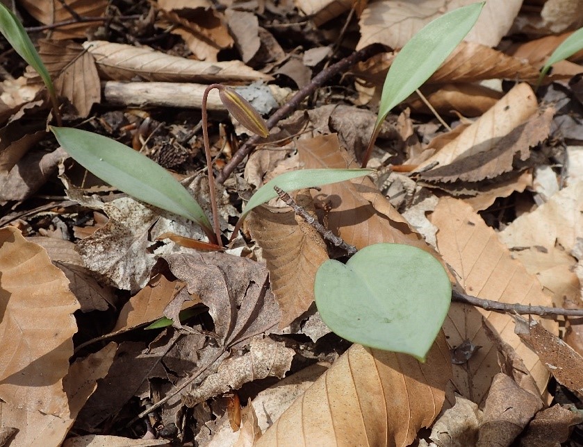 It is easy to miss the flowering of trout lily (Erythronium americanum) shown here in bud. The deep yellow flowers often finish flowering before the leaves come up. The leaves are waxy and often have dark patches that make them recognizable even without the flowers.