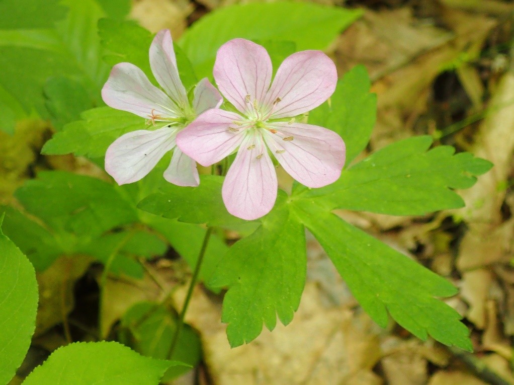 Wild geranium (Geranium maculatum) is a common native plant of the northeastern forest. The flowers look similar those of the red geranium that you see in window boxes and planters, also in the Geranium family but in a different Genus (Pelargonium) that is not native to the northeast.
